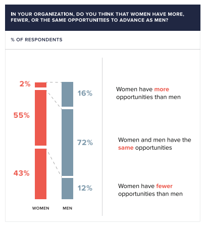 - Men don’t think there’s a problem. 88% of men think women have the same or better opportunities for advancement as men, compared to only 57% of women. An adorable 16% of men think women have more opportunities than men. If you’re one of those 16%, call me. I want to work for your company.