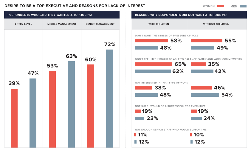 - Men are more likely than women to site “Family Responsibilities” as their reason for not wanting to advance to the top executive level. This flies in the face of the assumption that women are holding themselves back because they want to ensure they have time for an eventual family. Overall, women are most likely to site “stress/pressure” as their top reason for not wanting a top job.